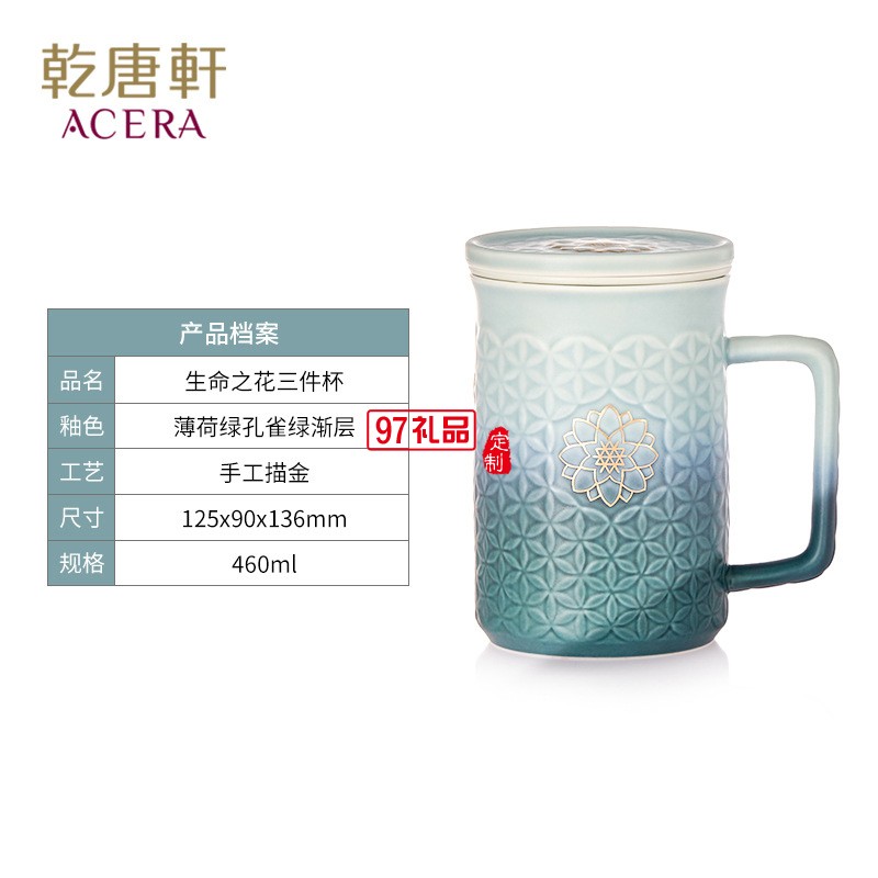 商務(wù)辦公杯帶蓋乾唐軒活瓷生命之花描金高杯送客戶隨手禮品460ml
