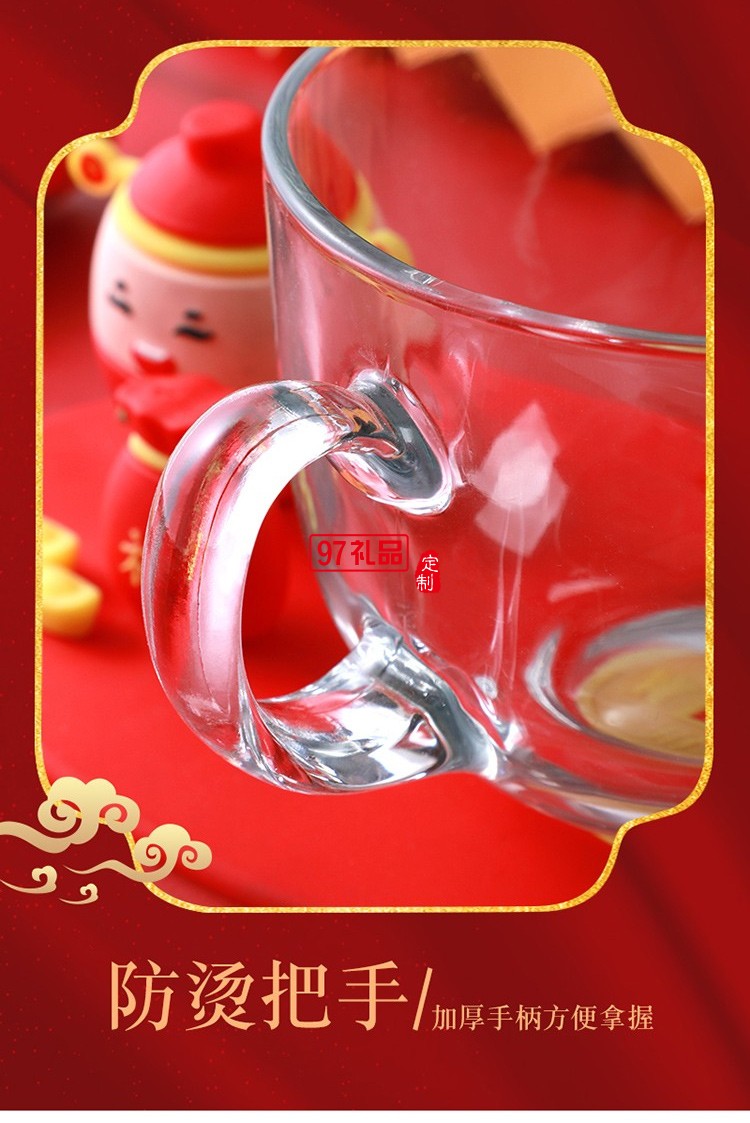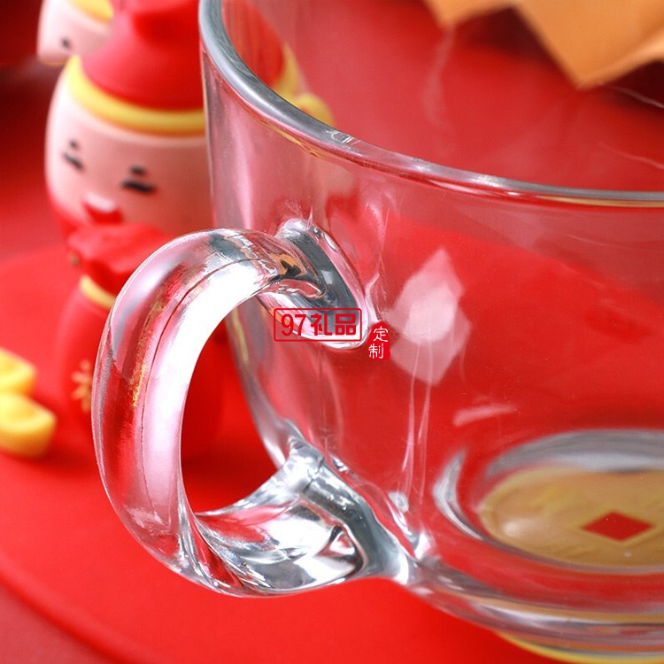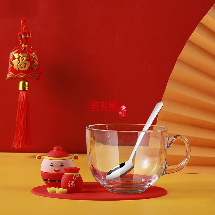 產(chǎn)品特點(diǎn): 杯子玻璃+PVC杯墊,攪拌勺不銹鋼材質(zhì)。獨(dú)特的財(cái)神爺和福袋設(shè)計(jì),寓意招財(cái)進(jìn)寶。原創(chuàng)設(shè)計(jì),圖案可定制。