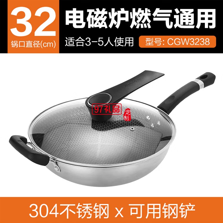 九陽蜂窩304不銹鋼炒鍋不粘平底炒菜鍋CGW3238定制公司廣告禮品