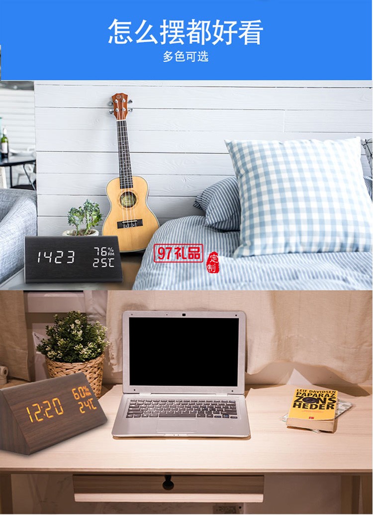 新款多功能溫濕度鬧鐘三角形木頭鐘電子鐘