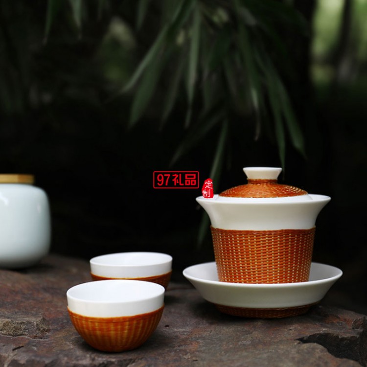 竹絲扣瓷瓷胎竹編手工制作青玉瓷一蓋碗二杯一茶葉罐滌塵