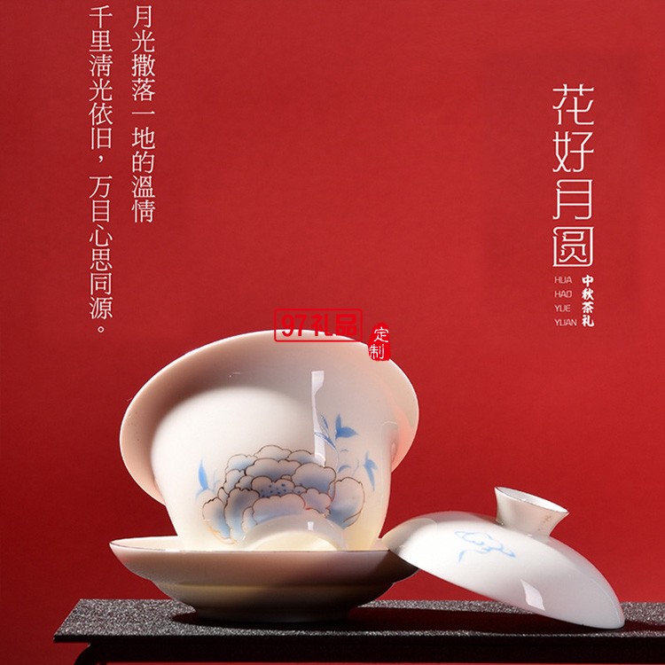 中秋國潮羊脂玉牡丹禮品茶具